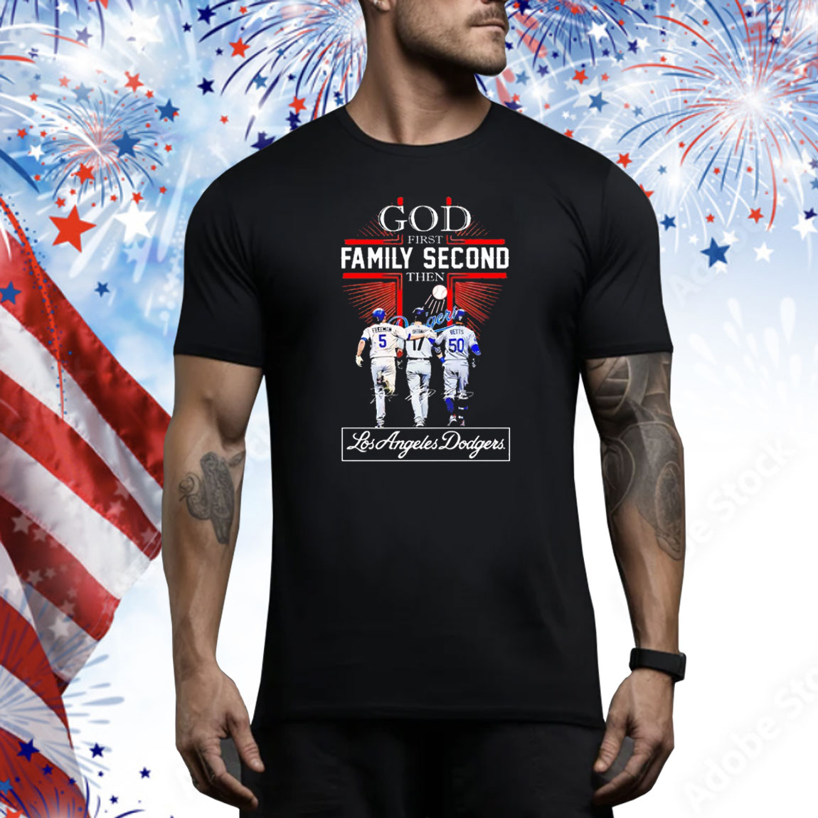 Freeman Ohtani Betts God First Family Second Los Angeles Dodgers Signatures Tee Shirt